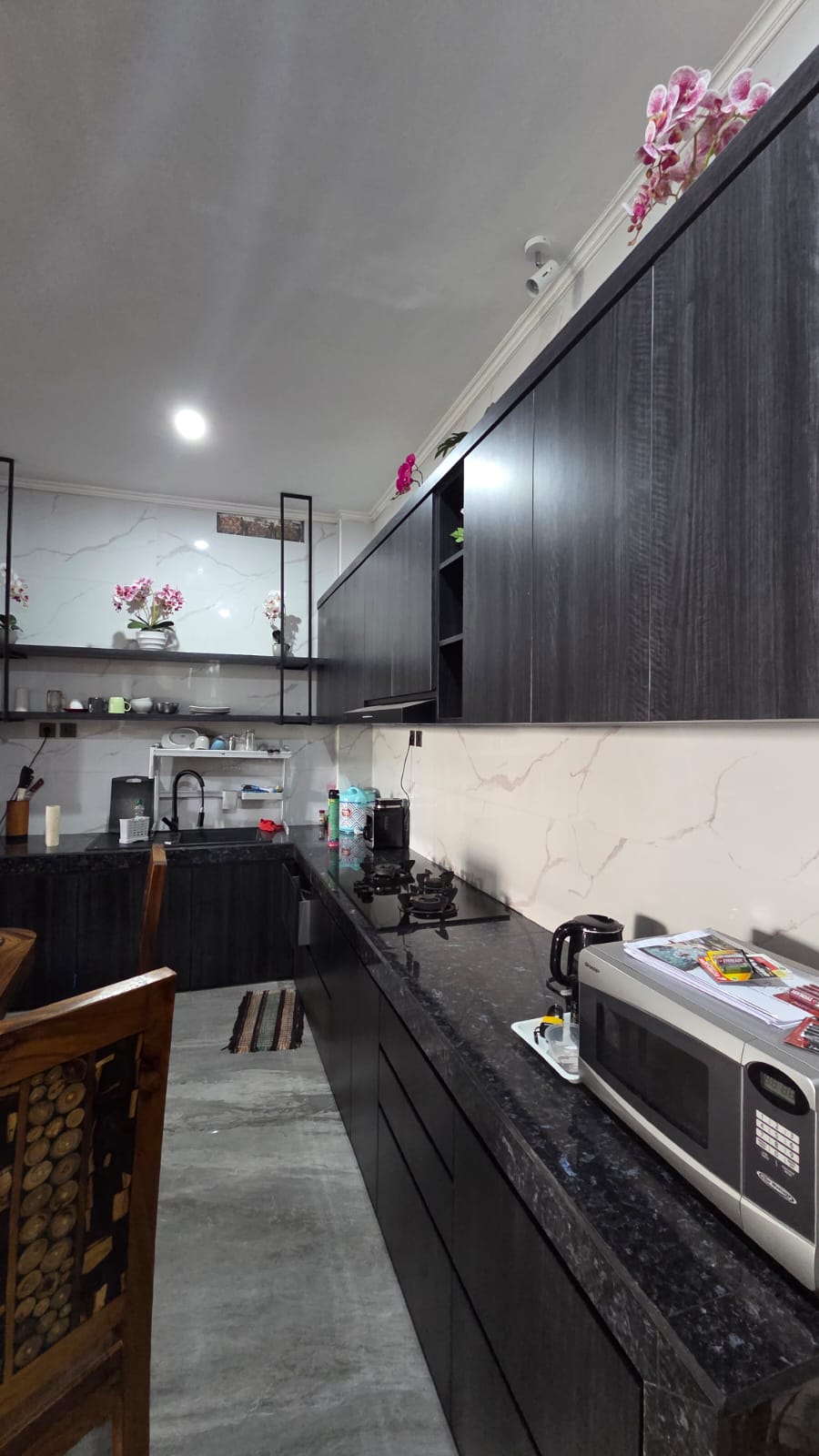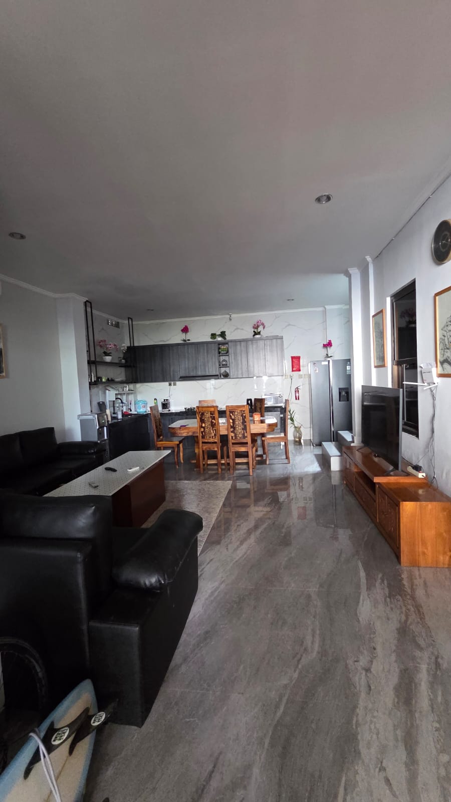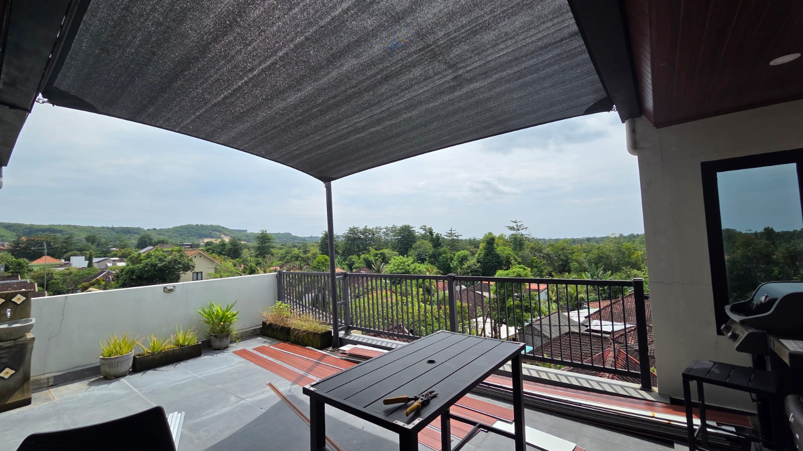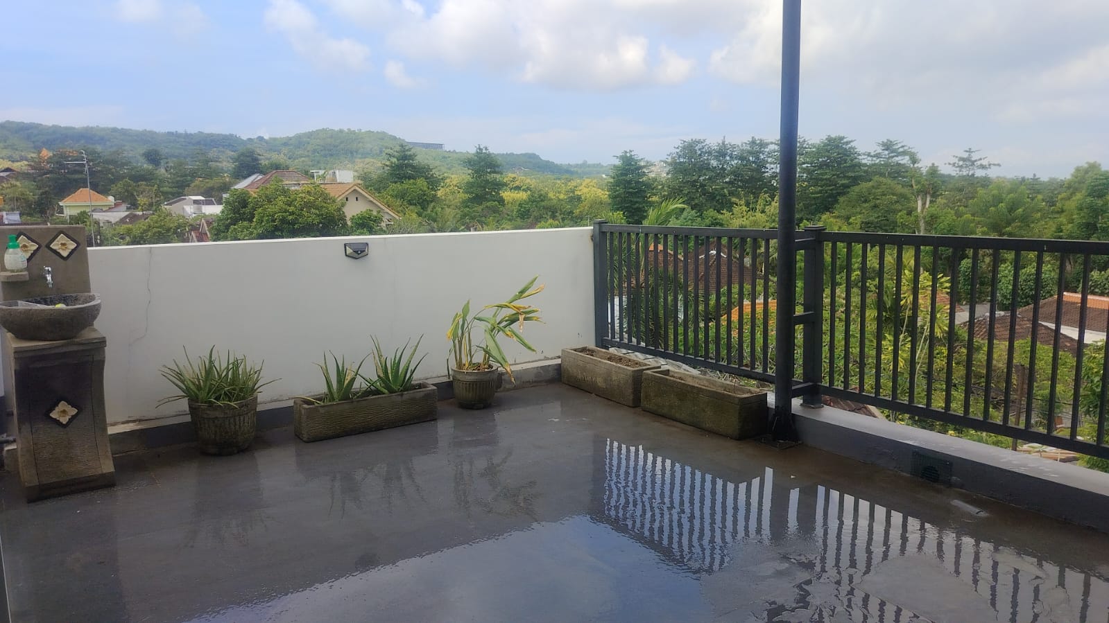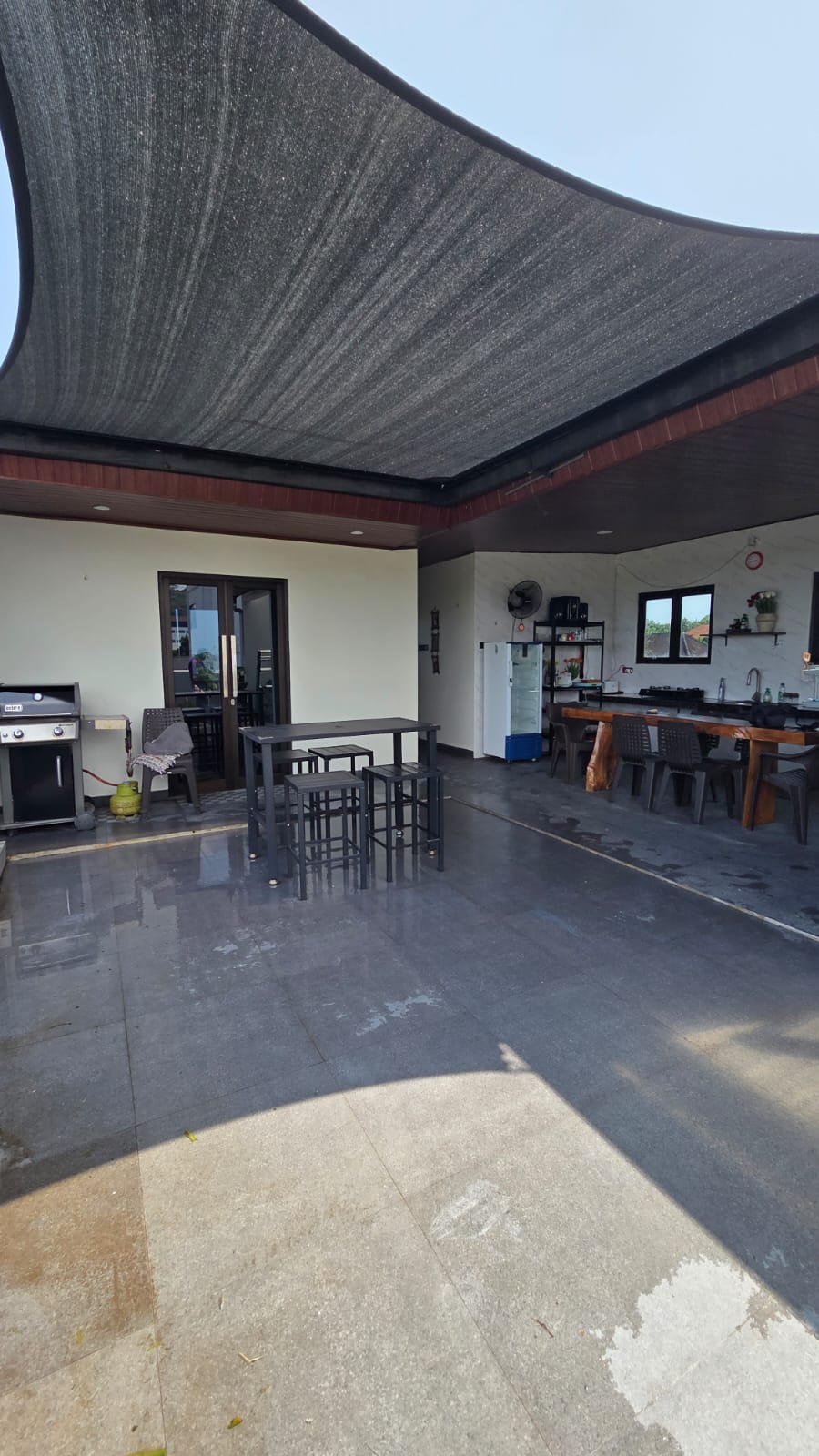 Area bbq with view, bbq, Tandon, meja kayu jati panjang, set kursi2 plastik, showcase minuman, fan, smart tv, bed serta king koil, AC, lemari, Wifi, tempat cctv di lantai 3 area bbq