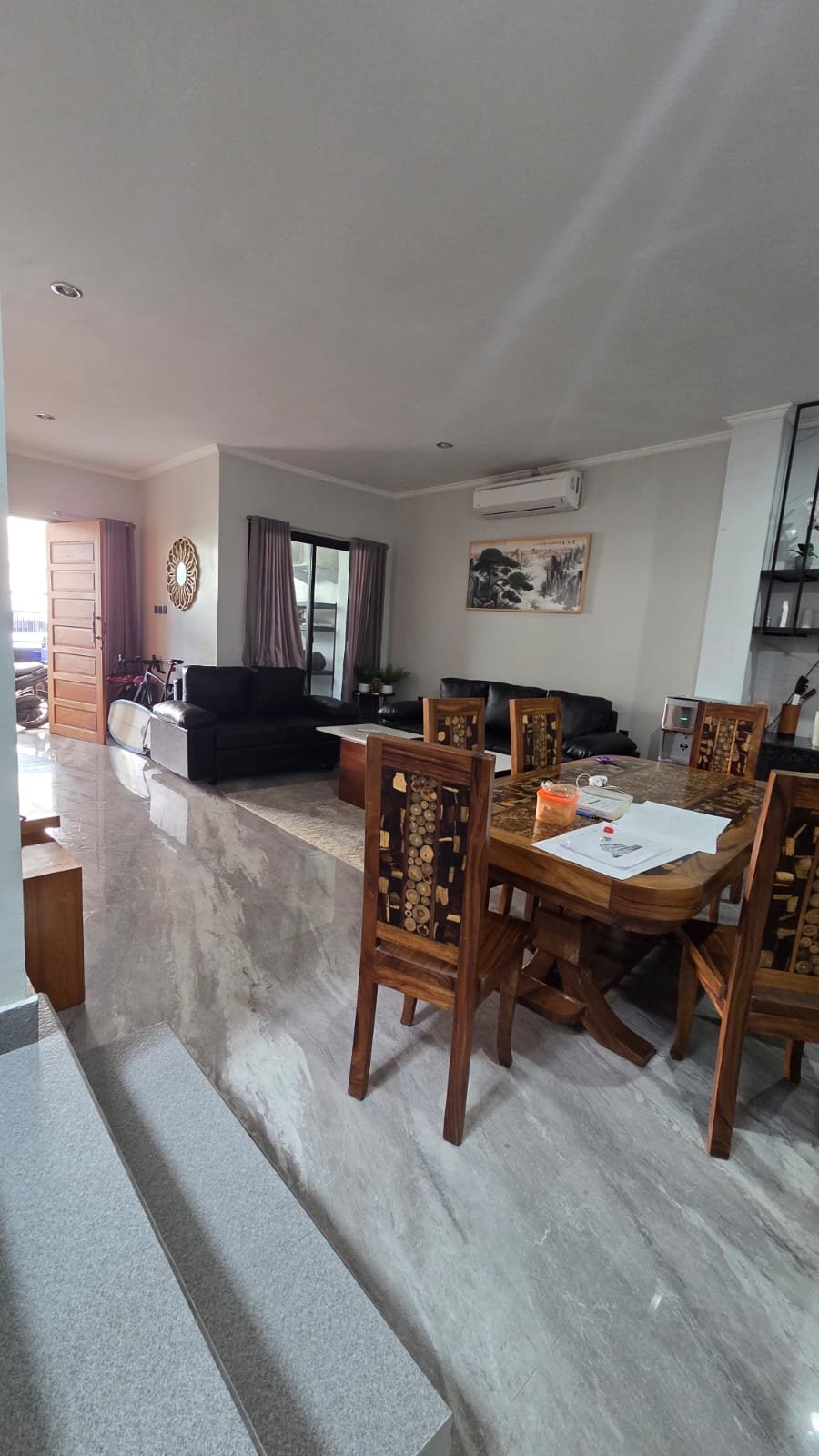 Tandon 5.500 liter, rak helm, sofa, microwave, smart tv, dispenser, kulkas 2 pintu, kompos dan gas, magic jar, kicthen set, tempat tidur 2, meja makan jati dan 6 kursi, lemari pakaian 2, ac daikin kamar 2, ac daikin 2.5pk ruang tamu 1, kaca rias, meja kayu jati panjang, tempat cctv di ruang tamu, tempat cctv di garasi