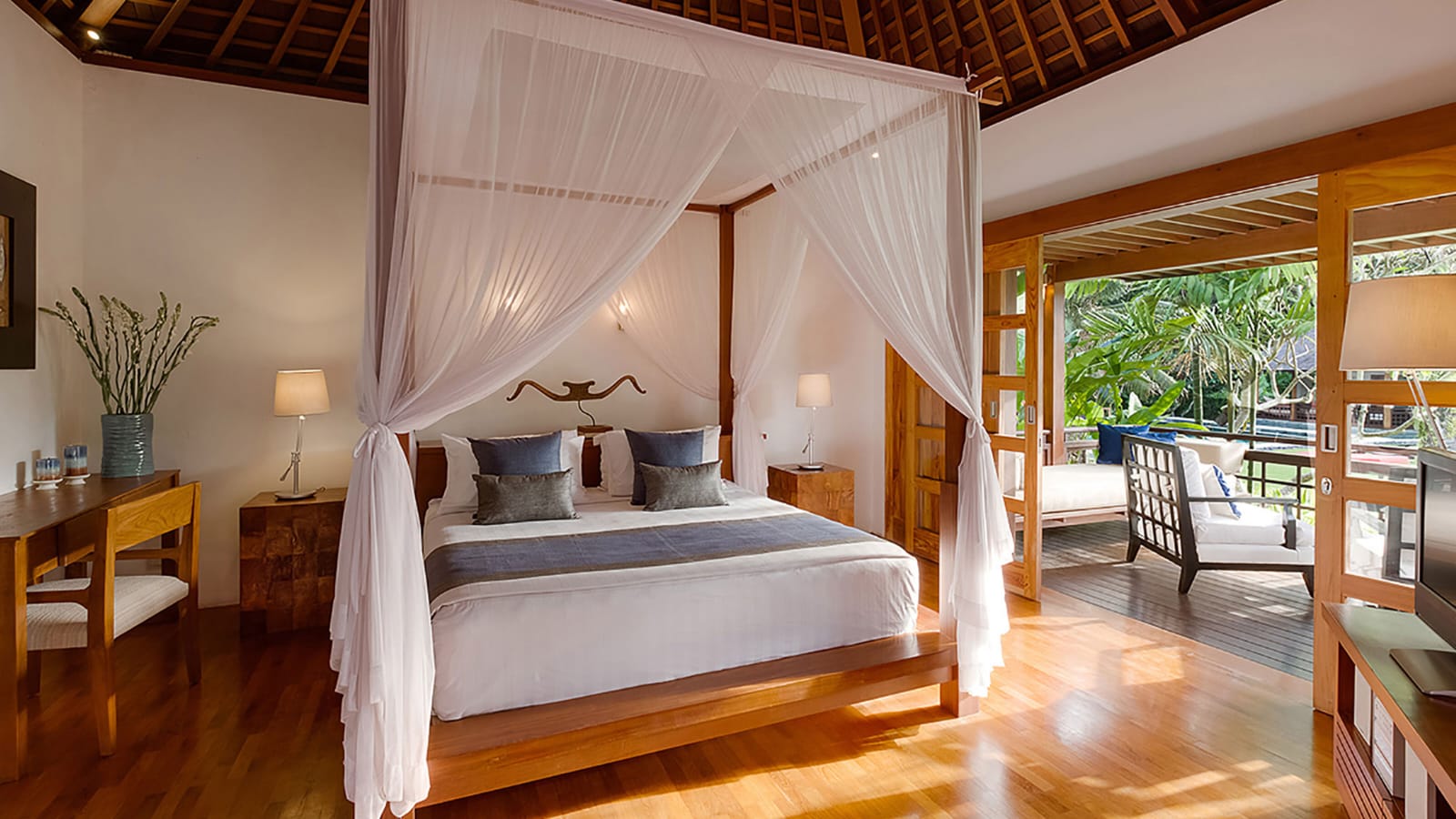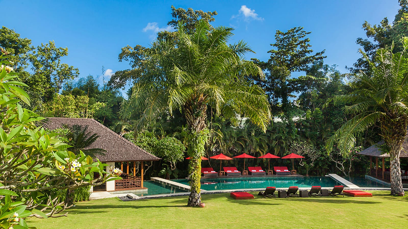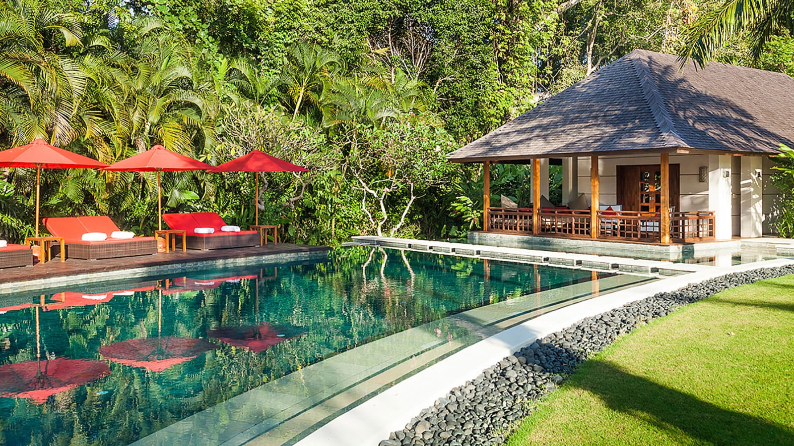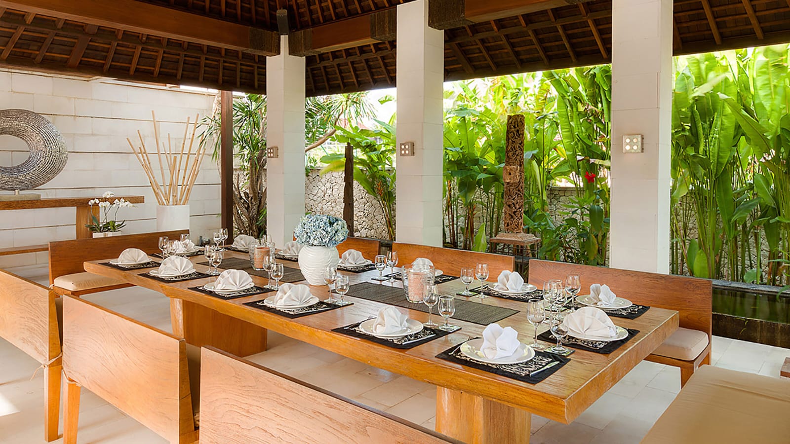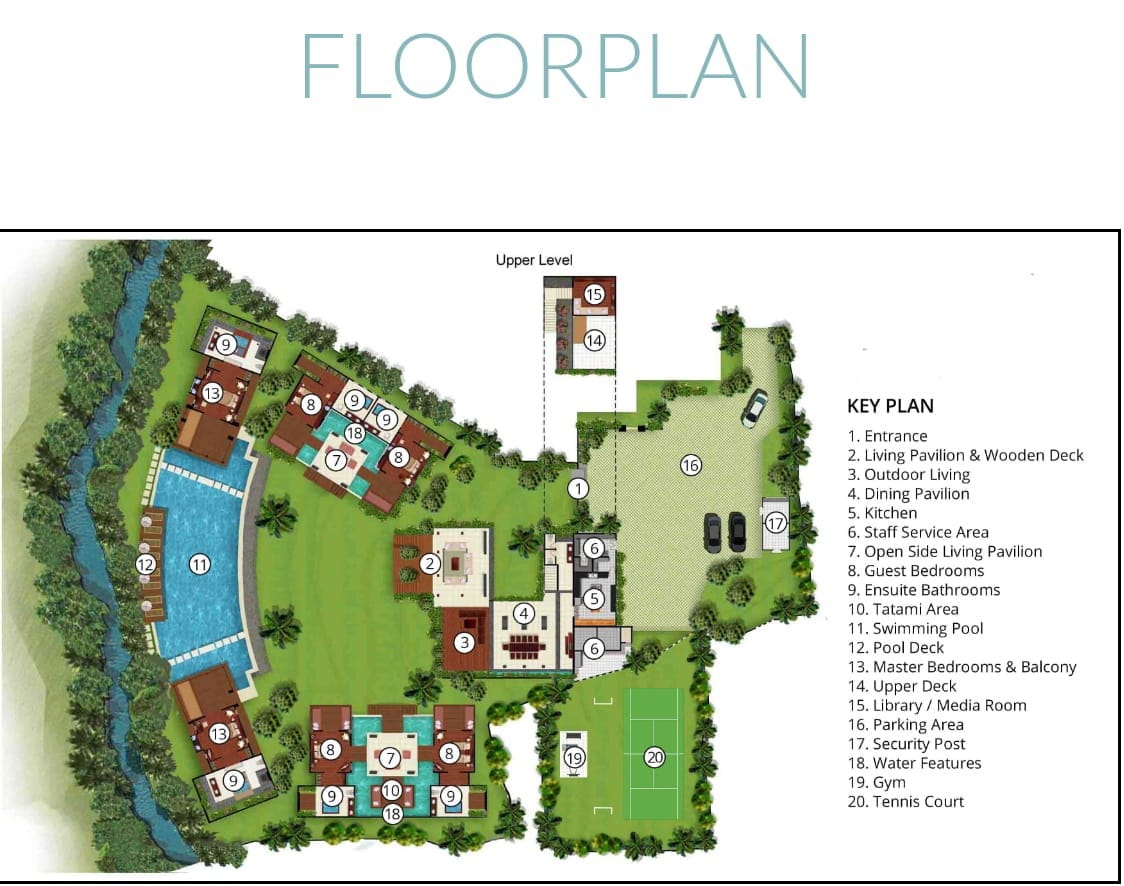 Two open-sided lounges separating the guest bedrooms pavilions — one with a Japanese-style massage area; terrace lounge