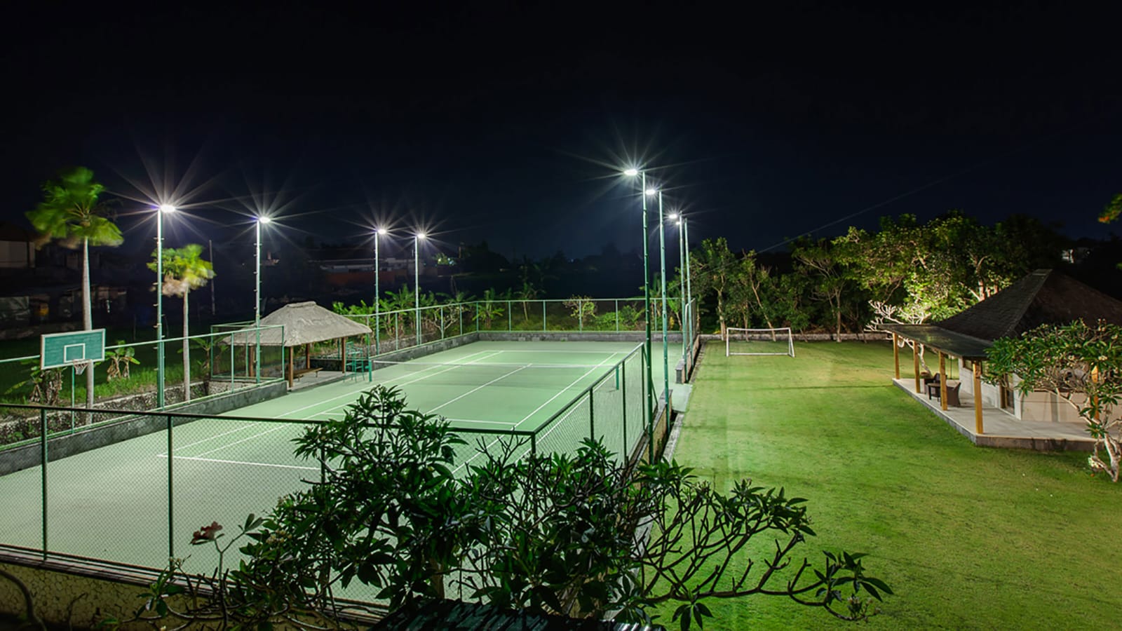 Tennis court with small balé